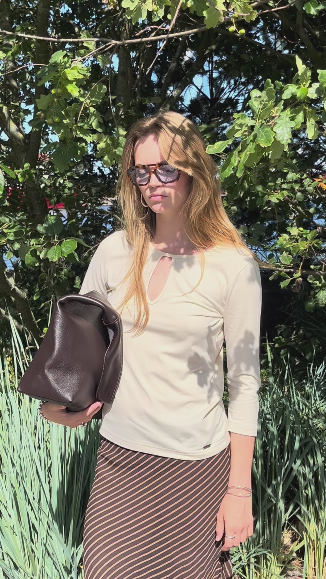 Tasken har et rummeligt hovedrum, en lille lynlåslomme og to indvendige lommer til småting. Den rummer bærbare computere i både 13" og 15". Tasken lukkes elegant med en metalknap med magnetisk effekt, og logoet er præget diskret på remmens ene side.